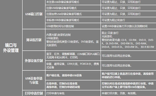 完全控制U盘、移动硬盘、数码相机、MP3以及其他USB存储设备的读写;可管控USB端口以及USB存储设备,还可控制其他的外围设备;