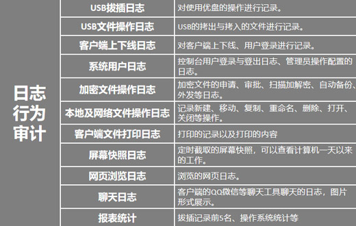 提供完整的日志管理,可以对加密文档的所有操作进行详尽的日志审计,并对审计日志提供查询、导出、备份及导出数据报表等支持;